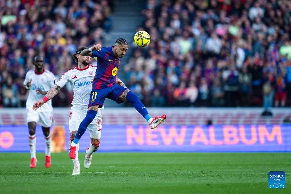 Barcelona's Raphinha (R) heads the ball during the La Liga football match between Barcelona and Sevilla FC in Barcelona, Spain, on March 15, 2026. (Photo by Joan Gosa/Xinhua)