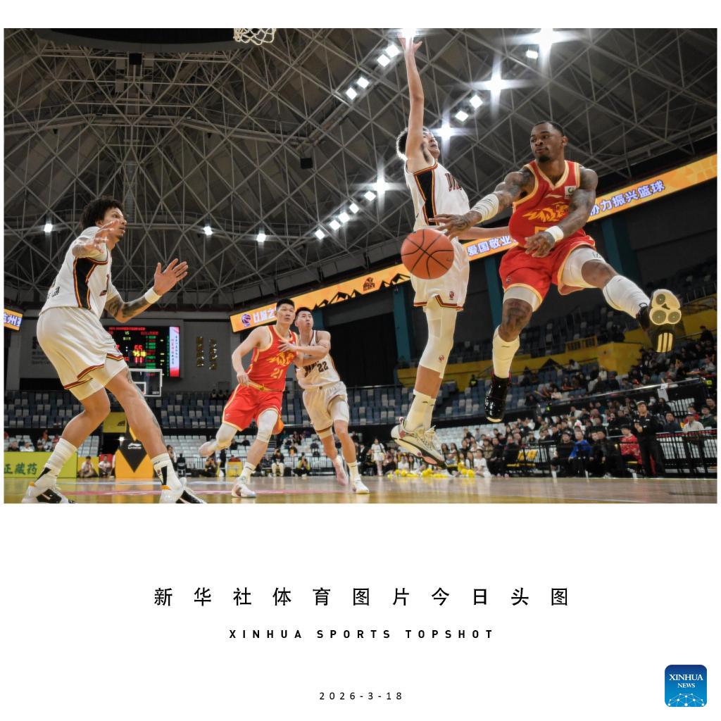 Rayjon Tucker (R) of Zhejiang Lions passes the ball during the 27th round match between Zhejiang Lions and Jilin Northeast Tigers at the 2025-2026 season of the Chinese Basketball Association (CBA) league in Hangzhou, east China's Zhejiang Province, March 18, 2026. (Xinhua/Jiang Han)