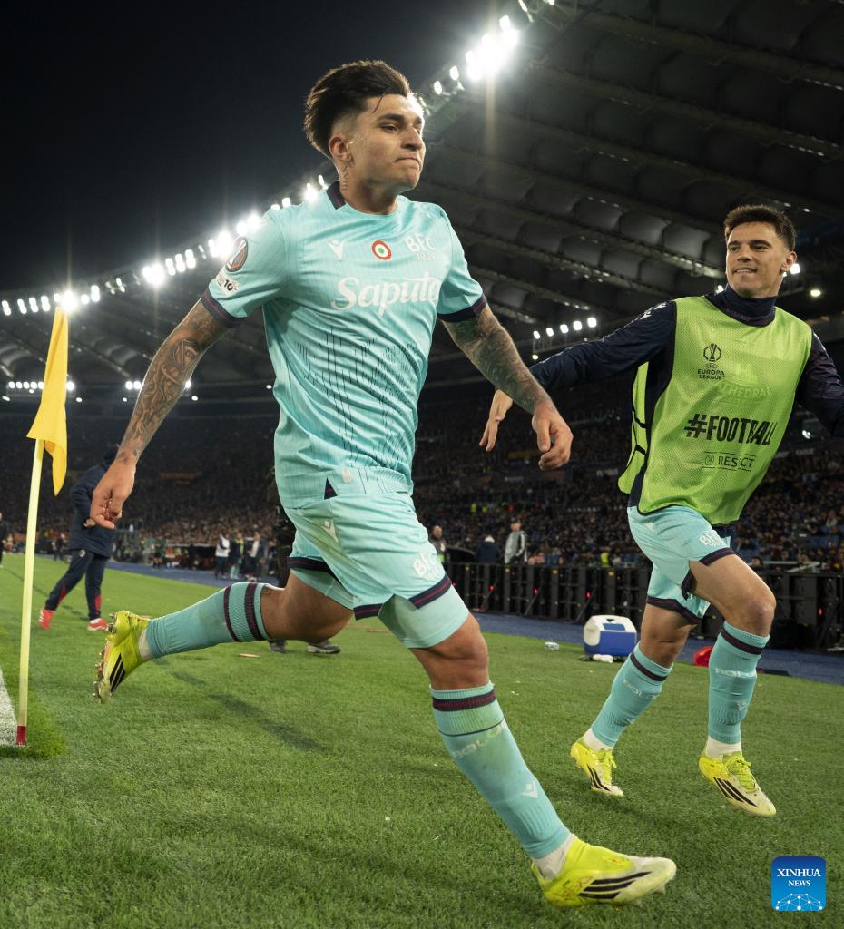 Bologna's Santiago Castro celebrates his goal during the UEFA Europa League round of 16 second leg match between Roma and Bologna in Rome, Italy, March 19, 2026. (Photo by Alberto Lingria/Xinhua)