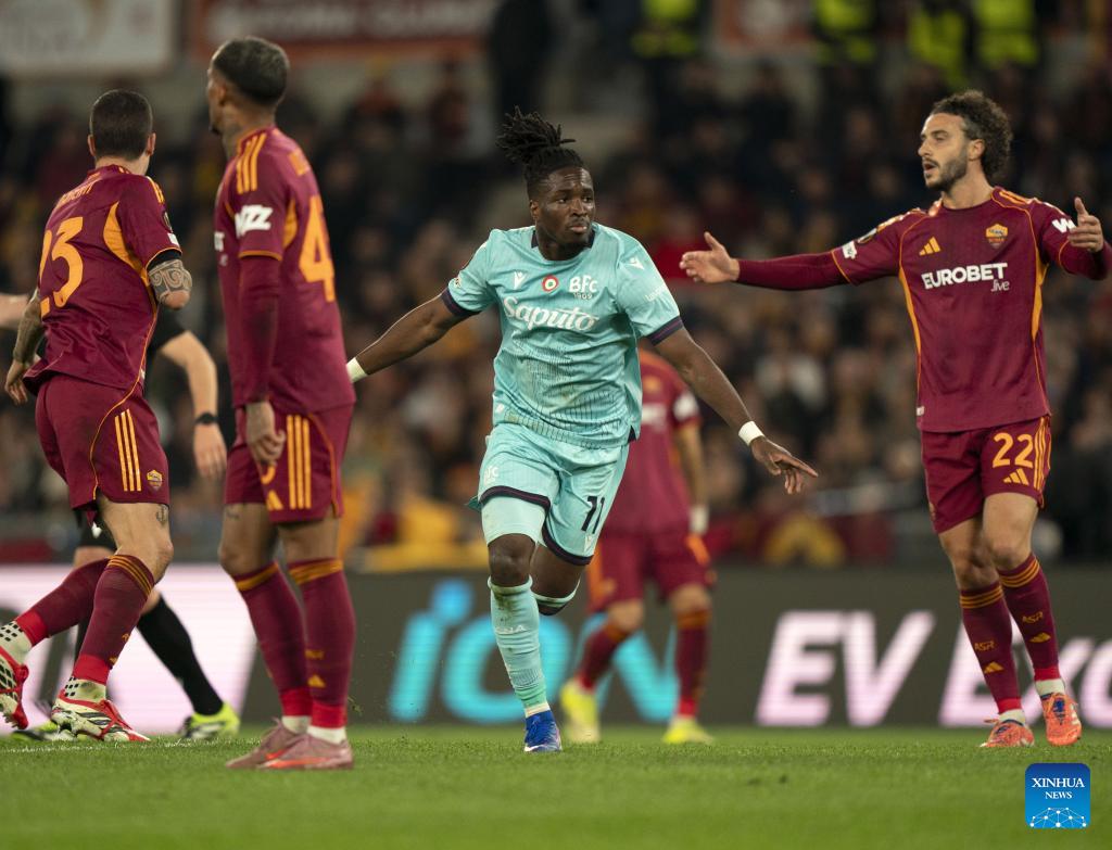 Roma's Evan Ndicka (C) celebrates his goal during the UEFA Europa League round of 16 second leg match between Roma and Bologna in Rome, Italy, March 19, 2026. (Photo by Alberto Lingria/Xinhua)