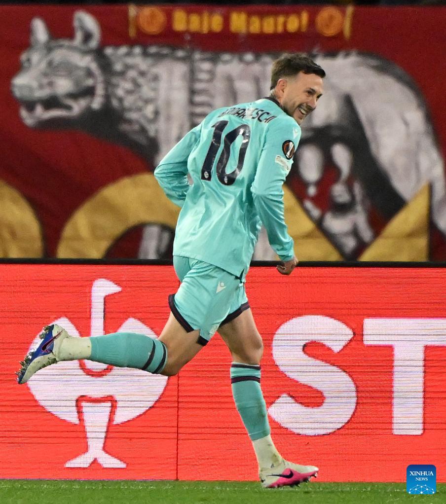 Bologna's Federico Bernardeschi celebrates his goal during the UEFA Europa League round of 16 second leg match between Roma and Bologna in Rome, Italy, March 19, 2026. (Photo by Alberto Lingria/Xinhua)