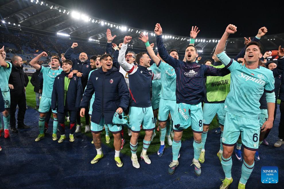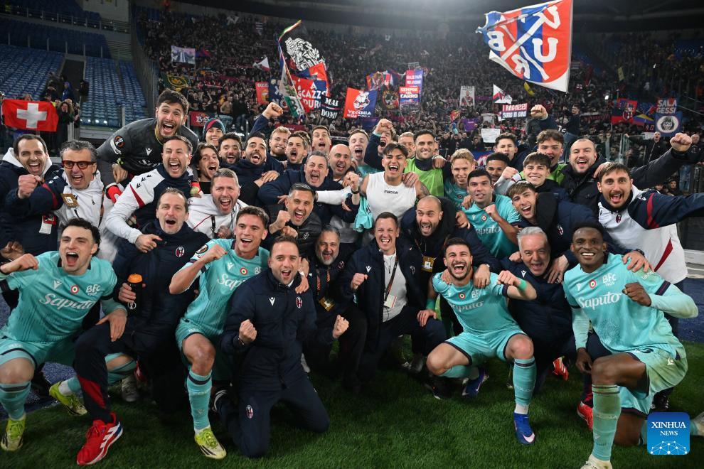 Players of Bologna celebrate after the UEFA Europa League round of 16 second leg match between Roma and Bologna in Rome, Italy, March 19, 2026. (Photo by Alberto Lingria/Xinhua)