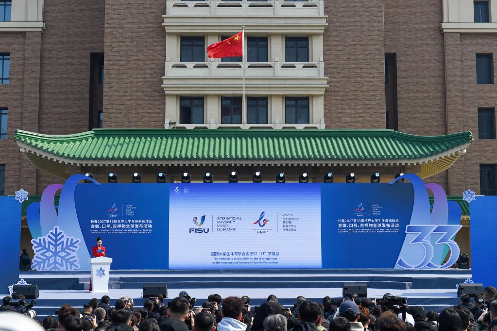 The emblem is unveiled at the global unveiling ceremony of the emblem, slogan and mascots for Changchun 2027 Winter Universiade in Changchun, northeast China's Jilin Province, March 21, 2026. To mark 300 days countdown to Changchun 2027 Winter Universiade, an unveiling ceremony of the games' emblem, slogan and mascots was held in Changchun on Saturday. (Xinhua/Zhang Nan)