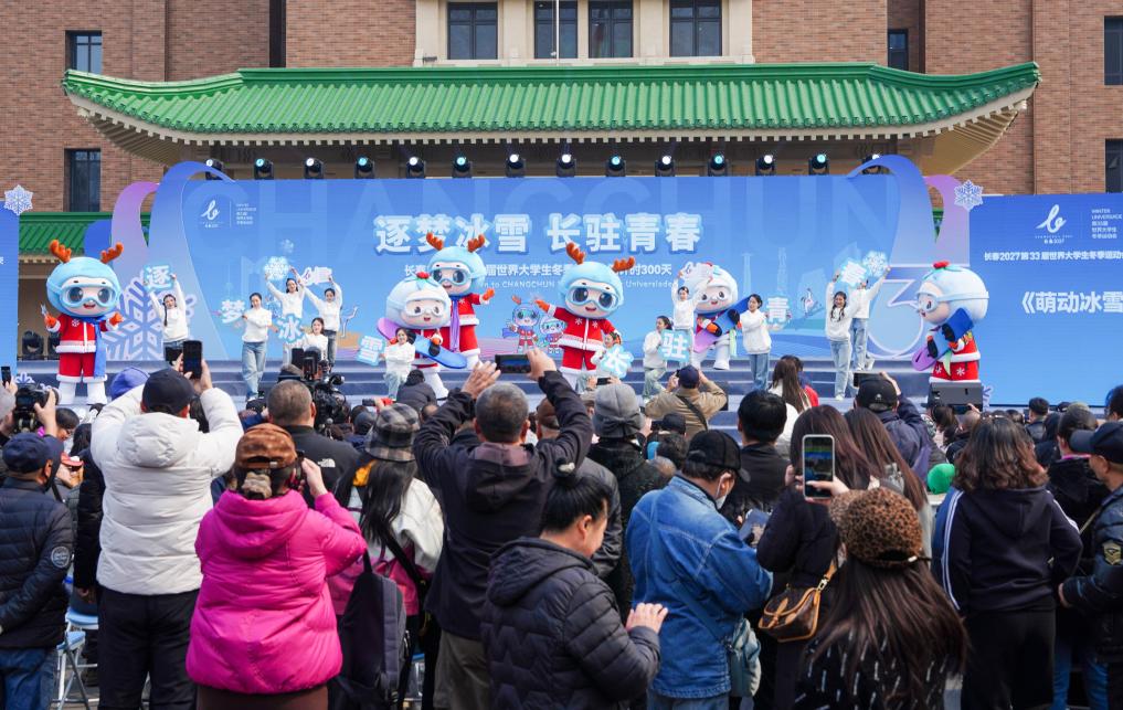 The mascots "Ji Bing" and "Ji Xue" are seen on parade in Changchun, northeast China's Jilin Province, March 21, 2026. To mark 300 days countdown to Changchun 2027 Winter Universiade, an unveiling ceremony of the games' emblem, slogan and mascots was held in Changchun on Saturday. (Xinhua/Zhang Nan)