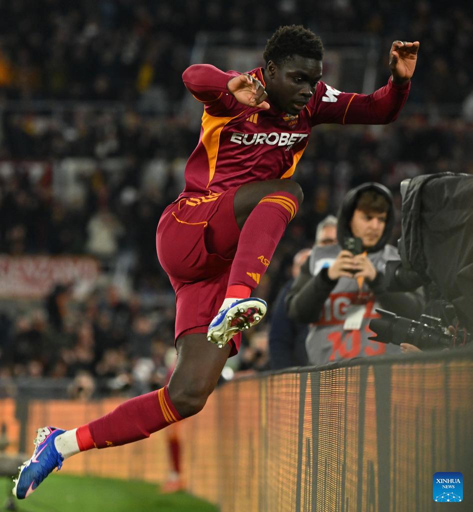 Roma's Robinio Vaz celebrates his goal during a Serie A football match between Roma and Lecce in Rome, Italy, March 22, 2026. (Photo by Alberto Lingria/Xinhua)