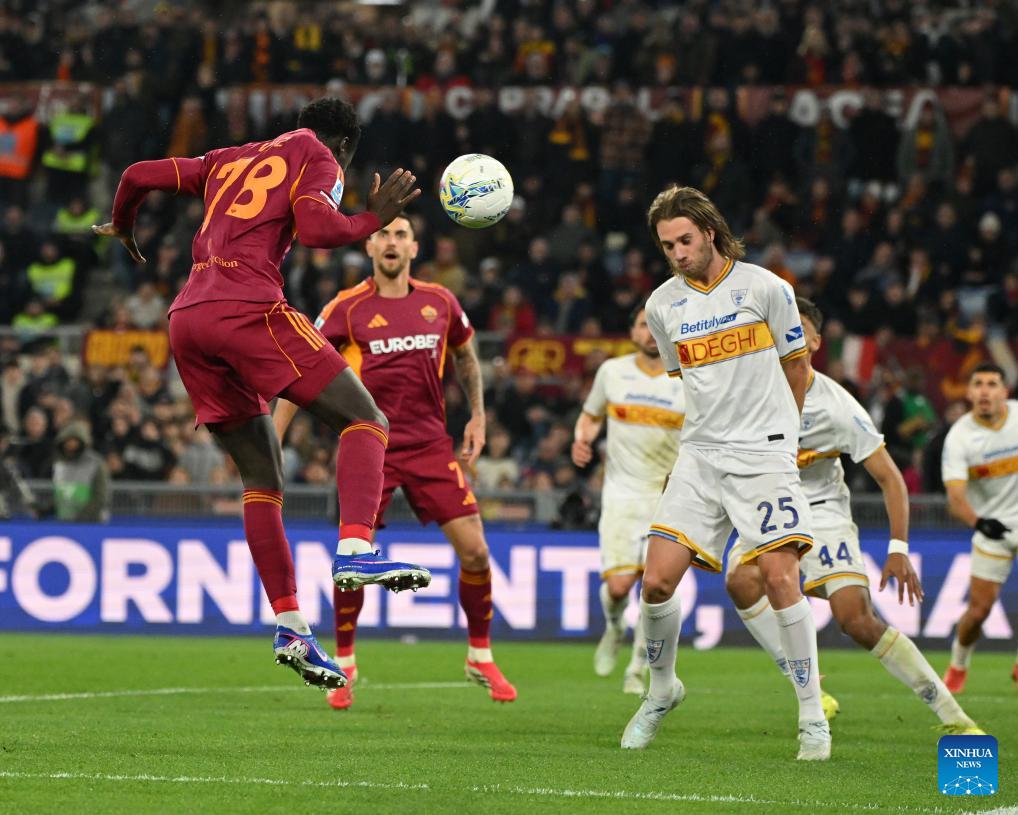 Roma's Robinio Vaz (1st L) heads to score during a Serie A football match between Roma and Lecce in Rome, Italy, March 22, 2026. (Photo by Alberto Lingria/Xinhua)
