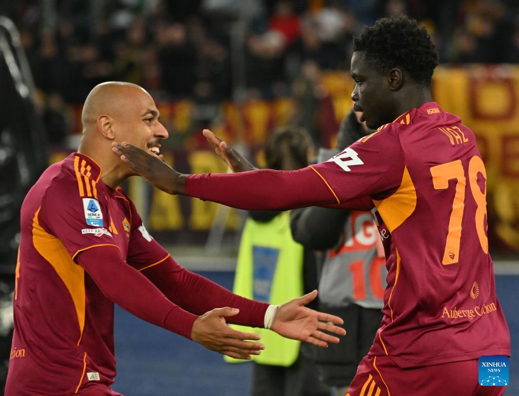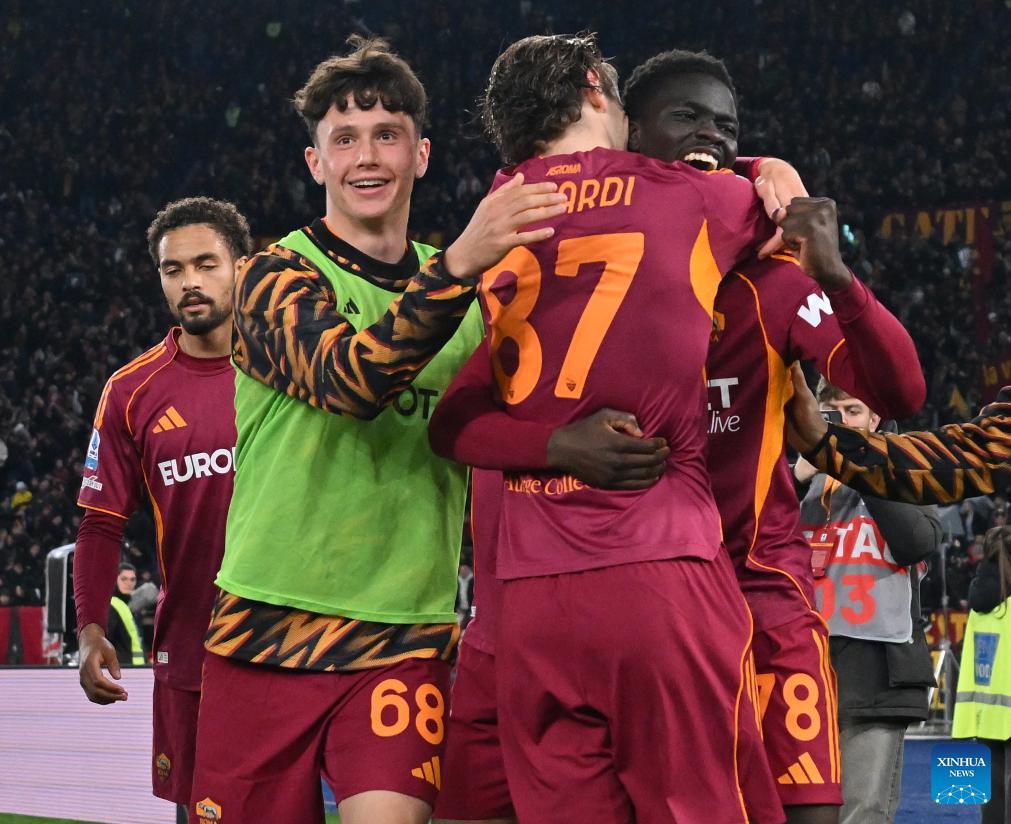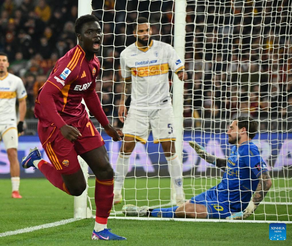 Roma's Robinio Vaz (1st R) celebrates his goal with teammates during a Serie A football match between Roma and Lecce in Rome, Italy, March 22, 2026. (Photo by Alberto Lingria/Xinhua)