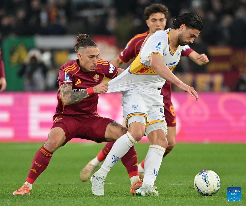 Roma's Kostas Tsimikas (L) vies with Lecce's Santiago Pierotti during a Serie A football match between Roma and Lecce in Rome, Italy, March 22, 2026. (Photo by Alberto Lingria/Xinhua)