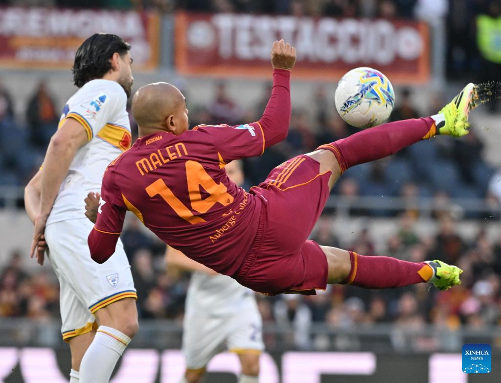 Roma's Donyell Malen (R) competes during a Serie A football match between Roma and Lecce in Rome, Italy, March 22, 2026. (Photo by Alberto Lingria/Xinhua)