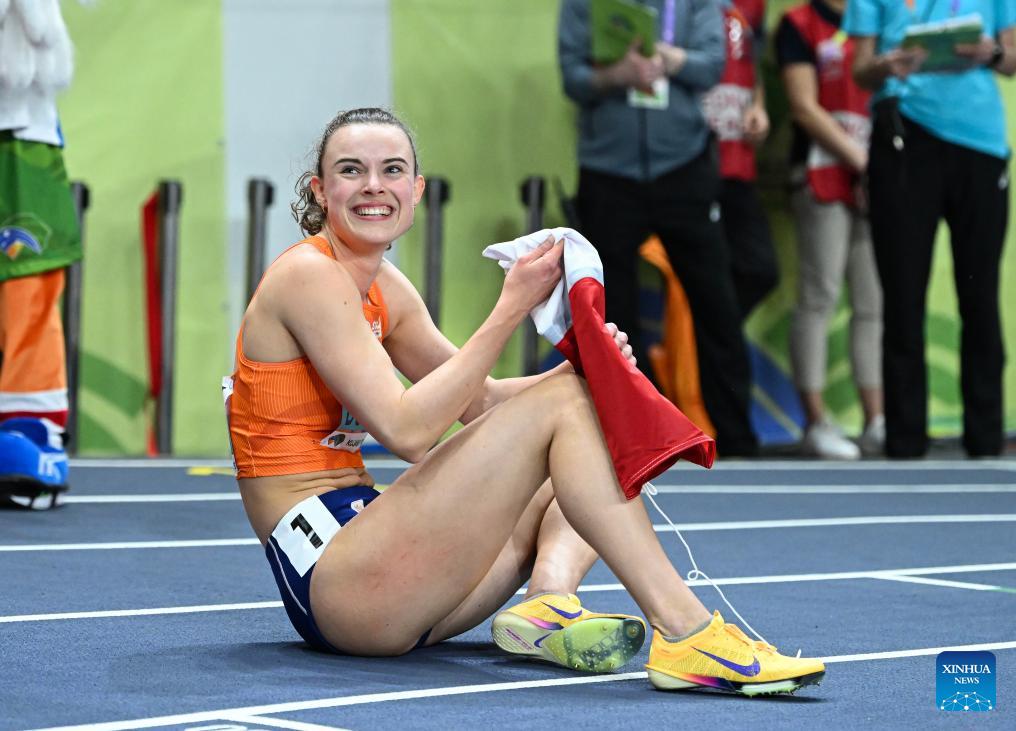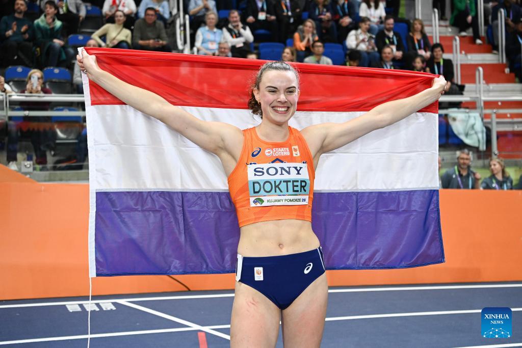 Gold medalist Sofie Dokter of the Netherlands celebrates after 800 metres of pentathlon at the 2026 World Athletics Indoor Championships in Torun, Poland, March 22, 2026. (Xinhua/Zhang Haofu)
