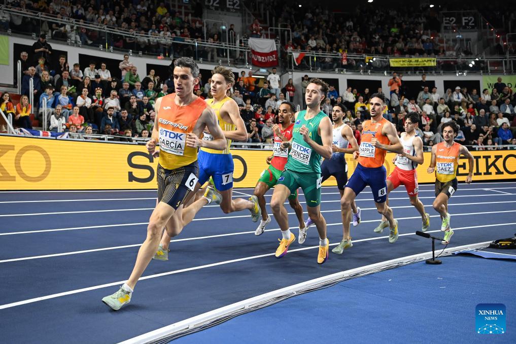 Mariano Garcia (1st L) of Spain competes during the men's 1500m final at the 2026 World Athletics Indoor Championships in Torun, Poland, on March 22, 2026. (Xinhua/Zhang Haofu)