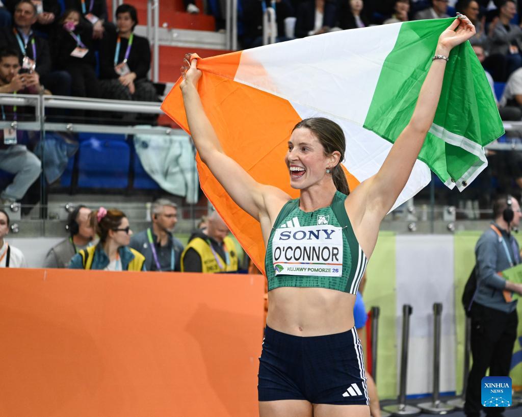 Bronze medalist Kate O'Connor of Ireland celebrates after 800 metres of pentathlon at the 2026 World Athletics Indoor Championships in Torun, Poland, March 22, 2026. (Xinhua/Zhang Haofu)