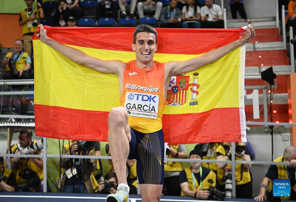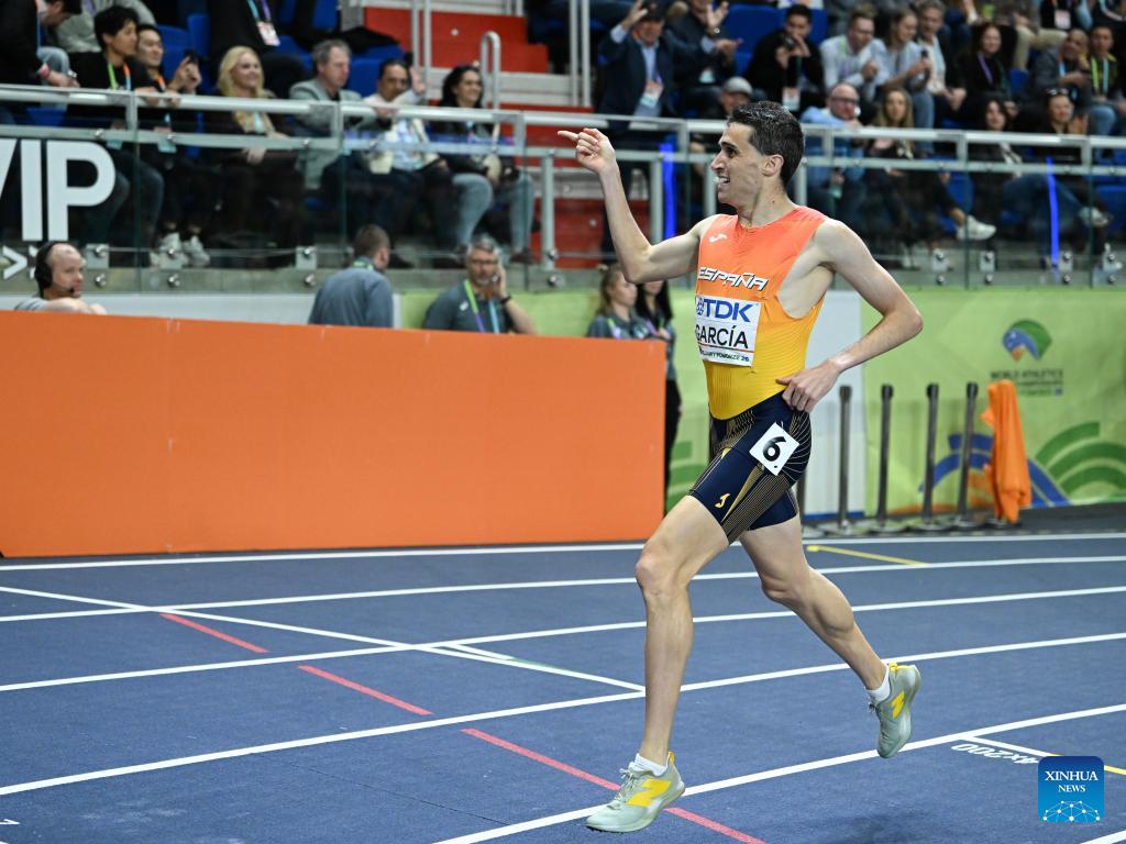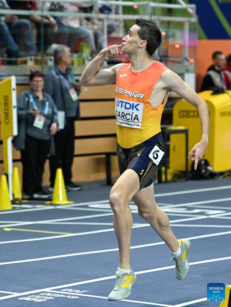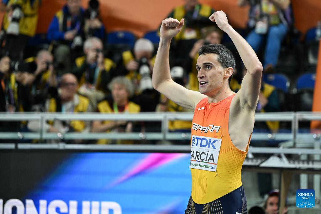 Mariano Garcia of Spain celebrates after winning the men's 1500m final at the 2026 World Athletics Indoor Championships in Torun, Poland, on March 22, 2026. (Xinhua/Zhang Haofu)