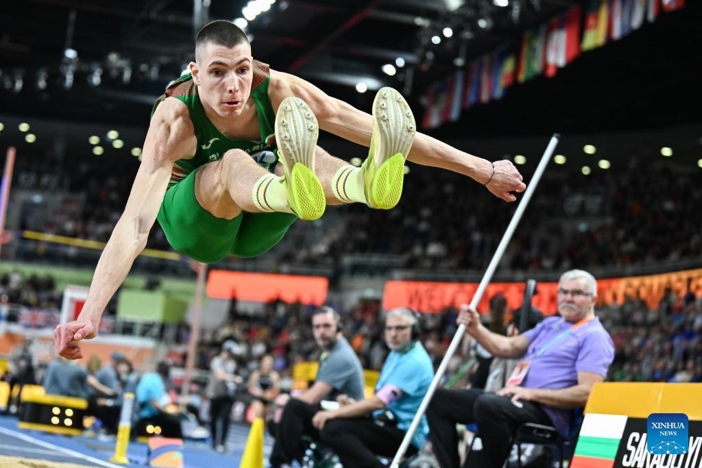 Bozhidar Saraboyukov of Bulgaria competes during the men's long jump final at the 2026 World Athletics Indoor Championships in Torun, Poland, March 22, 2026. (Xinhua/Zhang Haofu)