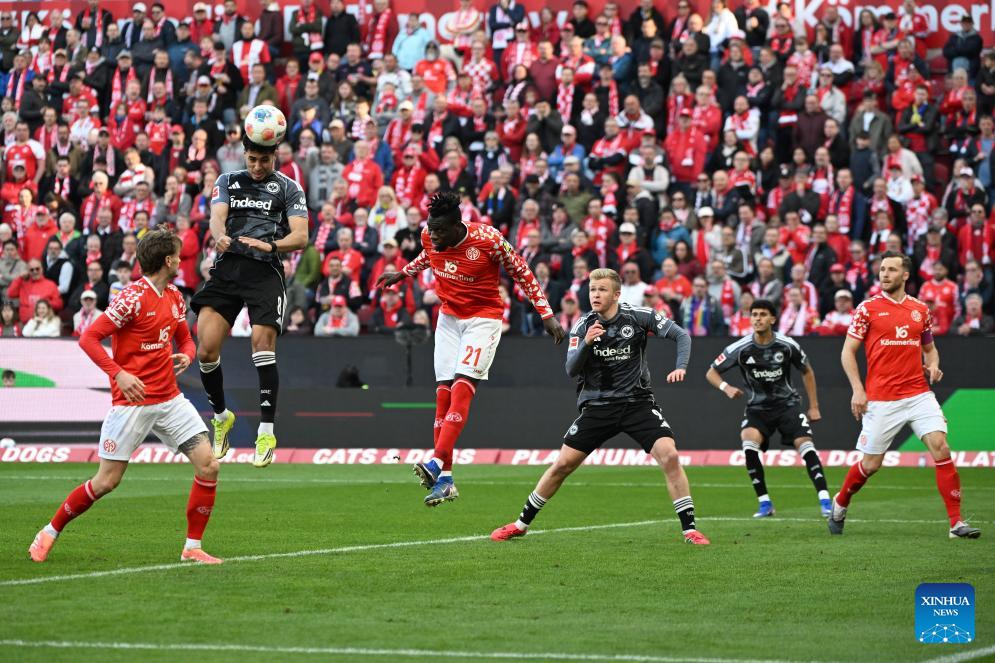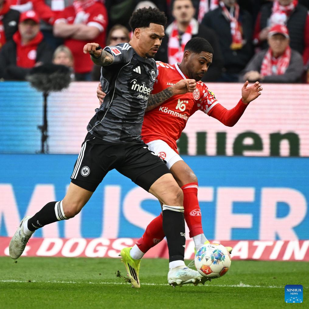 Fares Chaibi (2nd L) of Eintracht Frankfurt heads for the ball during the German first division Bundesliga football match between FSV Mainz 05 and Eintracht Frankfurt in Mainz, Germany, March 22, 2026. (Photo by Ulrich Hufnagel/Xinhua)