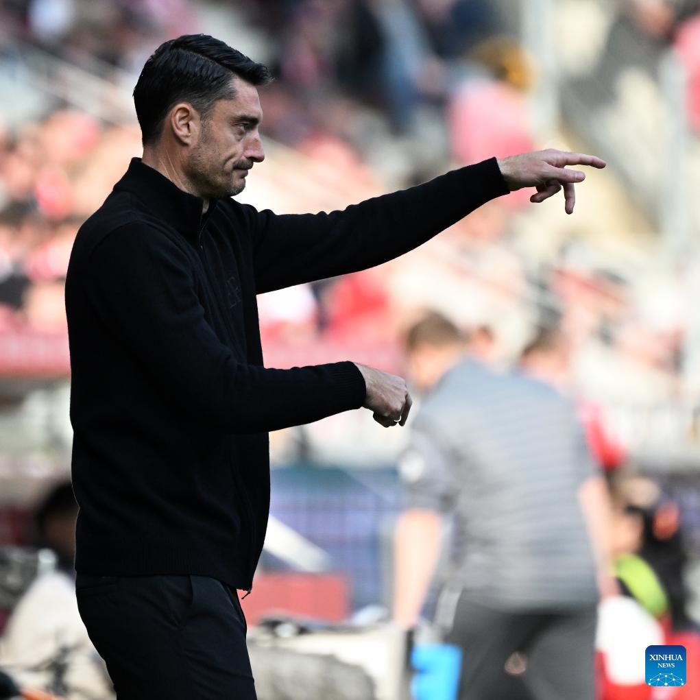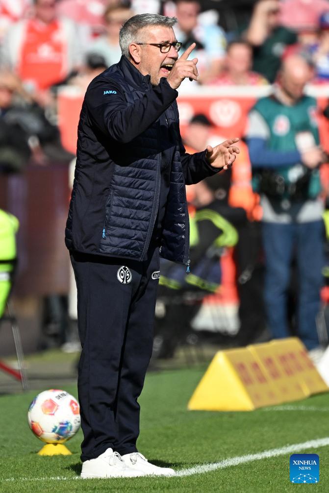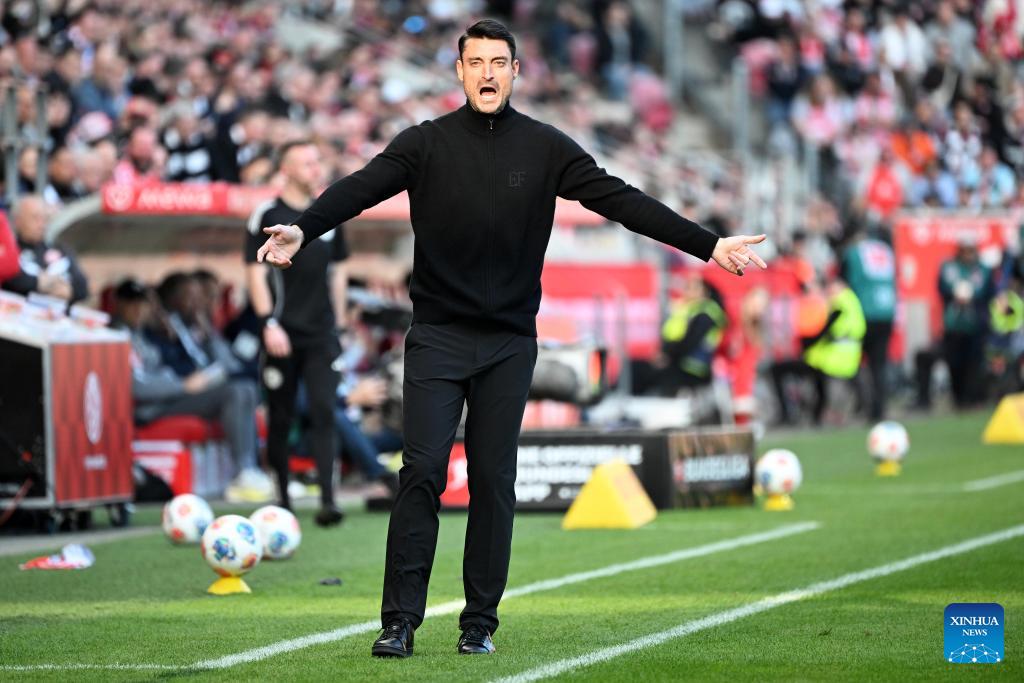 Benjamin Hoffmann, head coach of FSV Mainz 05 gestures during the German first division Bundesliga football match between FSV Mainz 05 and Eintracht Frankfurt in Mainz, Germany, March 22, 2026. (Photo by Ulrich Hufnagel/Xinhua)
