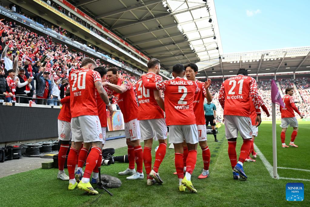 Players of FSV Mainz 05 celebrate scoring during the German first division Bundesliga football match between FSV Mainz 05 and Eintracht Frankfurt in Mainz, Germany, March 22, 2026. (Photo by Ulrich Hufnagel/Xinhua)
