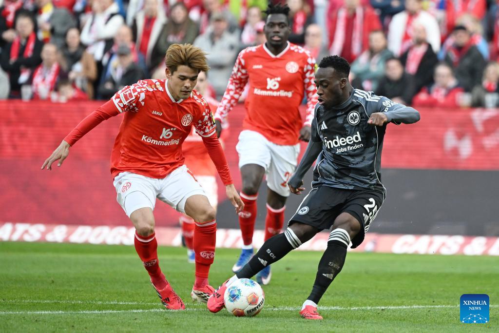 Sano Kaishu (L) of FSV Mainz 05 vies with Arnaud Kalimuendo of Eintracht Frankfurt during the German first division Bundesliga football match between FSV Mainz 05 and Eintracht Frankfurt in Mainz, Germany, March 22, 2026. (Photo by Ulrich Hufnagel/Xinhua)