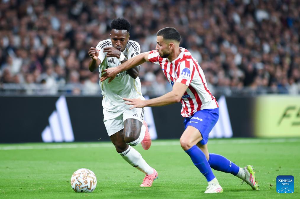 Real Madrid's Vinicius Junior (L) vies with Atletico de Madrid's David Hancko during a La Liga football match between Real Madrid and Atletico de Madrid in Madrid, Spain, on March 22, 2026. (Photo by Gustavo Valiente/Xinhua)