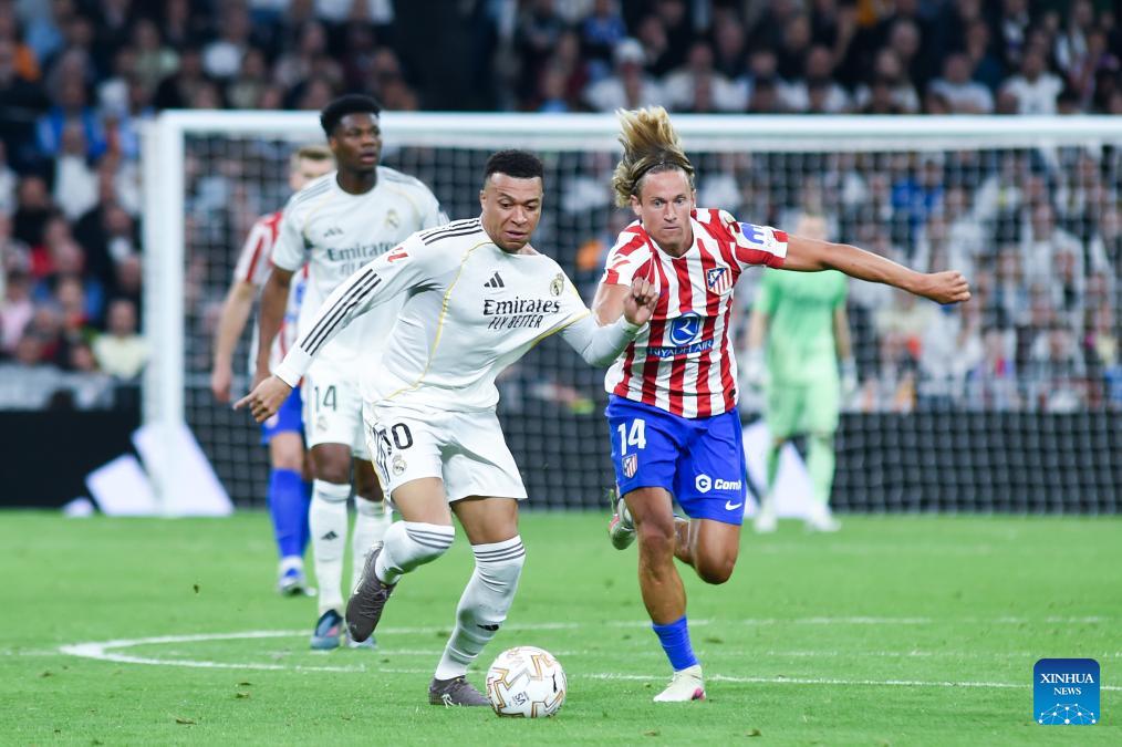 Real Madrid's Kylian Mbappe (L) vies with Atletico de Madrid's Marcos Llorente during a La Liga football match between Real Madrid and Atletico de Madrid in Madrid, Spain, on March 22, 2026. (Photo by Gustavo Valiente/Xinhua)