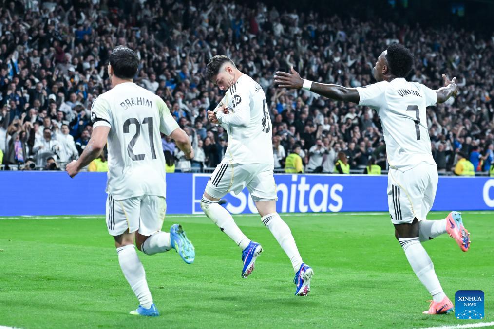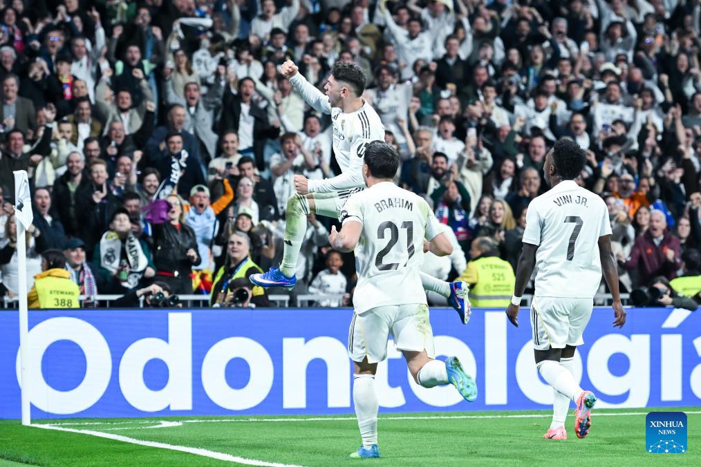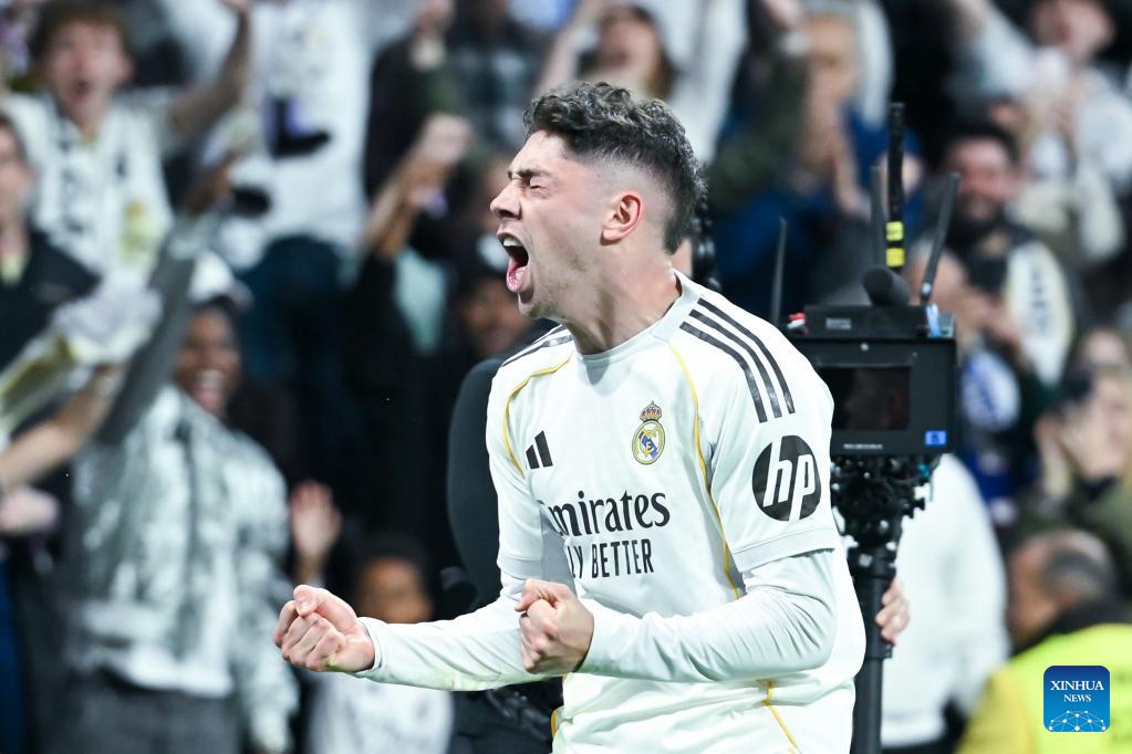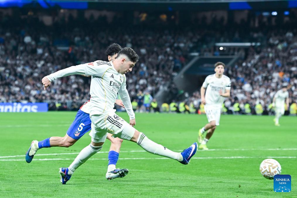 Real Madrid's Federico Valverde celebrates his goal during a La Liga football match between Real Madrid and Atletico de Madrid in Madrid, Spain, on March 22, 2026. (Photo by Gustavo Valiente/Xinhua)