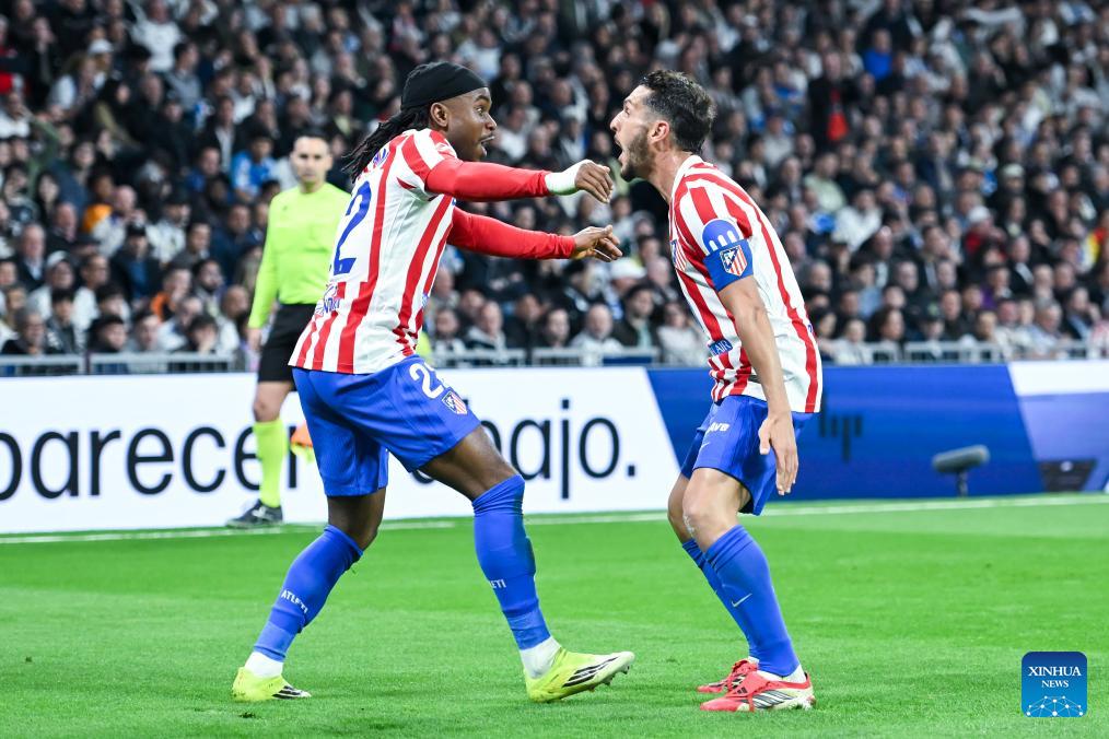 Atletico de Madrid's Ademola Lookman (L) celebrates his goal with Koke during a La Liga football match between Real Madrid and Atletico de Madrid in Madrid, Spain, on March 22, 2026. (Photo by Gustavo Valiente/Xinhua)