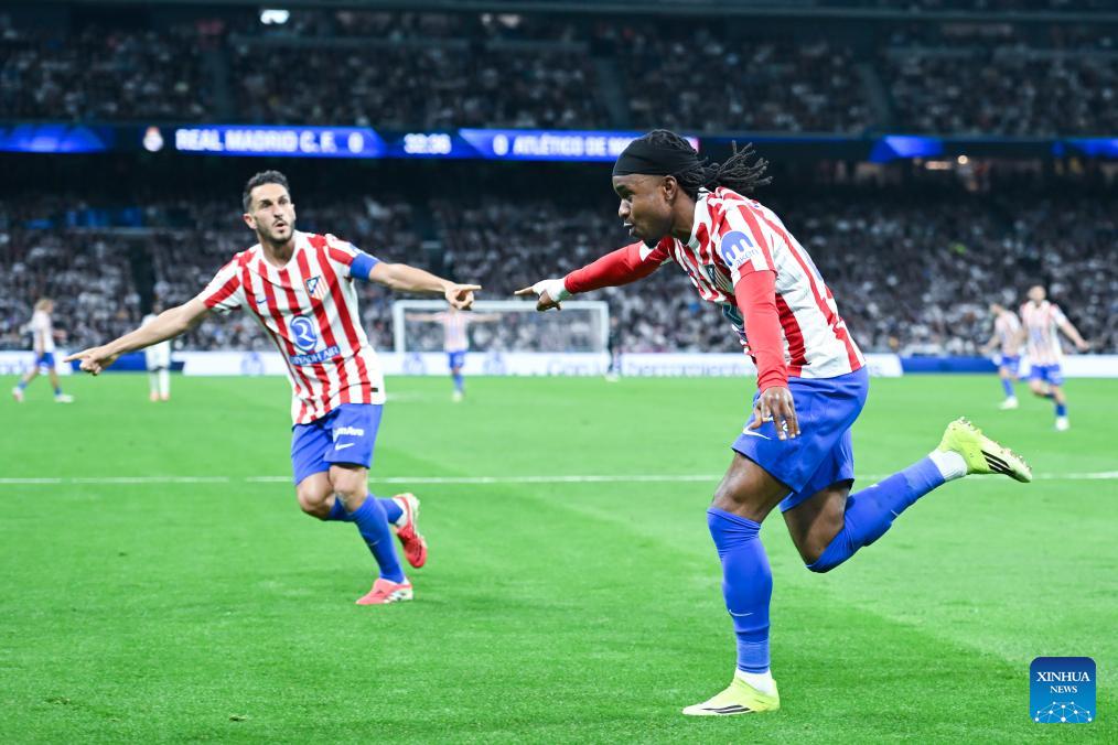 Atletico de Madrid's Ademola Lookman (R) celebrates his goal during a La Liga football match between Real Madrid and Atletico de Madrid in Madrid, Spain, on March 22, 2026. (Photo by Gustavo Valiente/Xinhua)
