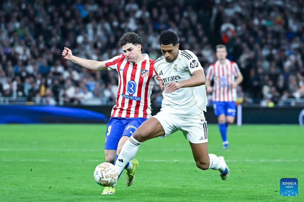 Real Madrid's Jude Bellingham (R) vies with Atletico de Madrid's Julian Alvarez during a La Liga football match between Real Madrid and Atletico de Madrid in Madrid, Spain, on March 22, 2026. (Photo by Gustavo Valiente/Xinhua)