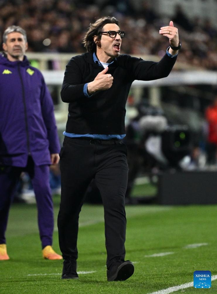 Fiorentina's head coach Paolo Vanoli gestures during a Serie A football match between Fiorentina and Inter Milan in Florence, Italy, March 22, 2026. (Xinhua)