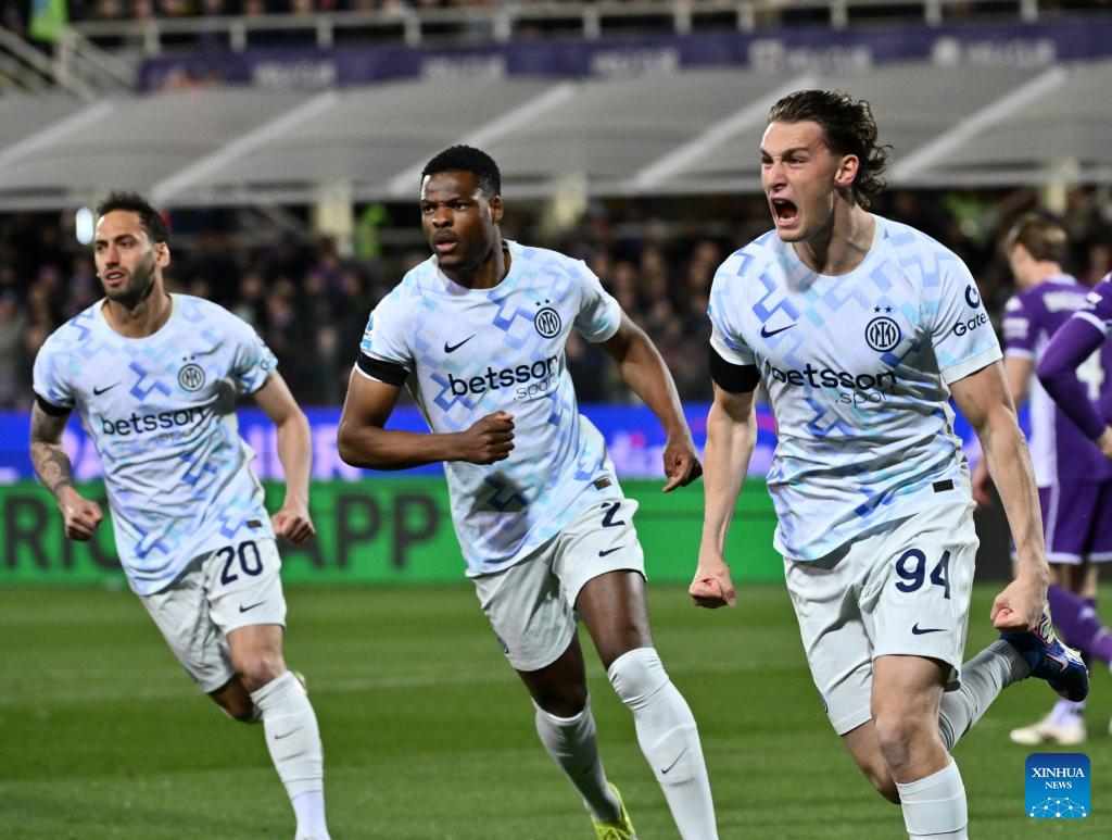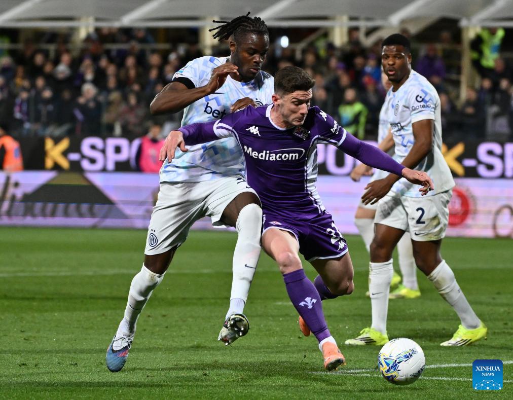 Inter Milan's Yann Bisseck (L) vies with Fiorentina's Robin Gosens (C) during a Serie A football match between Fiorentina and Inter Milan in Florence, Italy, March 22, 2026. (Xinhua)