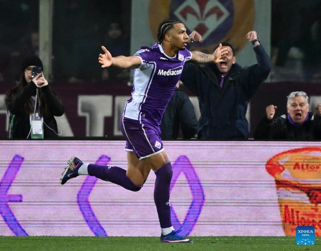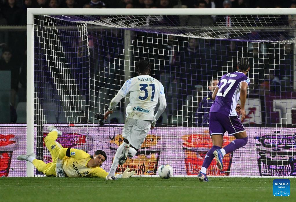 Fiorentina's Cher Ndour (R) scores during a Serie A football match between Fiorentina and Inter Milan in Florence, Italy, March 22, 2026. (Xinhua)