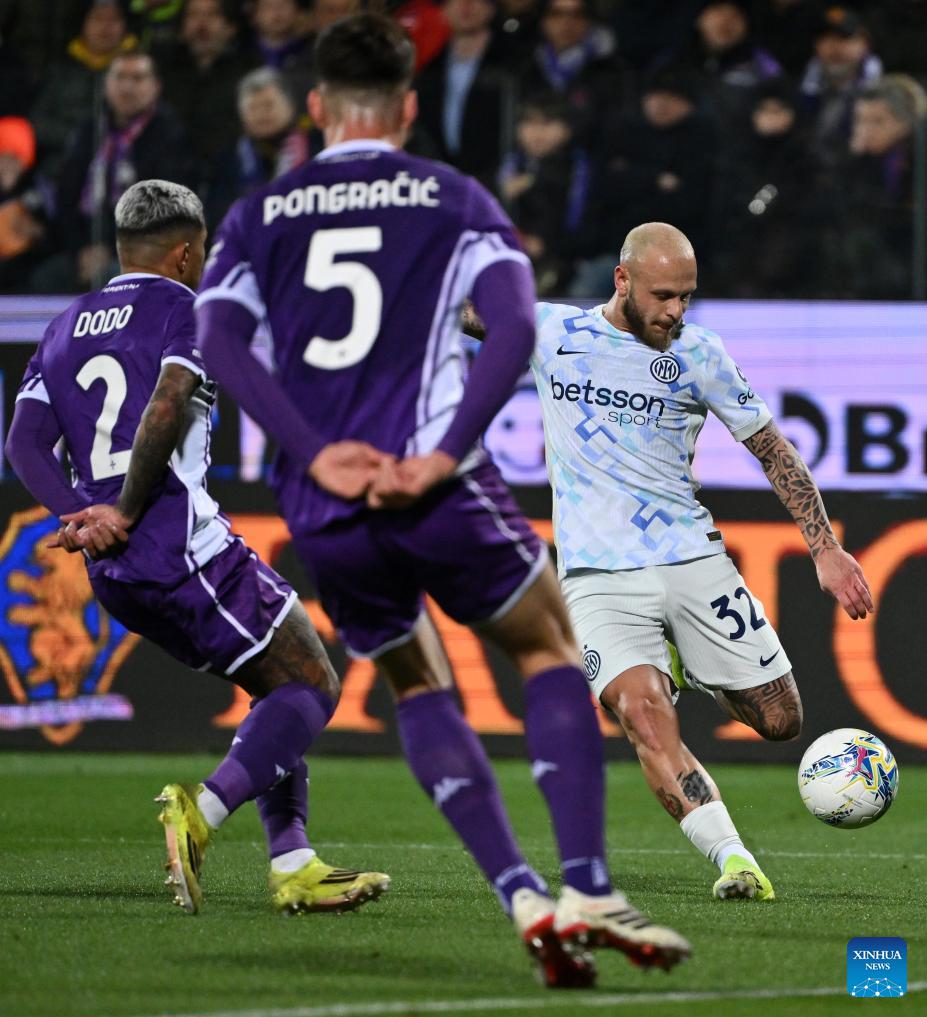 Inter Milan's Federico Dimarco (R) shoots during a Serie A football match between Fiorentina and Inter Milan in Florence, Italy, March 22, 2026. (Xinhua)