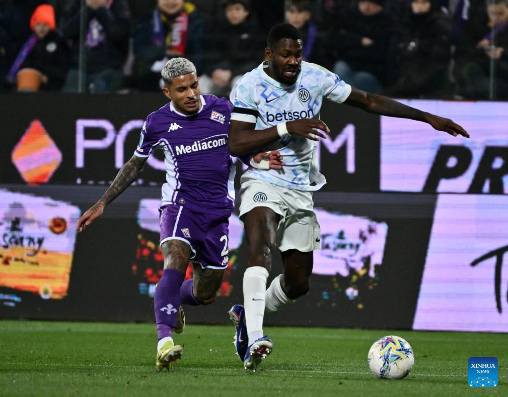 Inter Milan's Marcus Thuram (R) vies with Fiorentina's Dodo during a Serie A football match between Fiorentina and Inter Milan in Florence, Italy, March 22, 2026. (Xinhua)