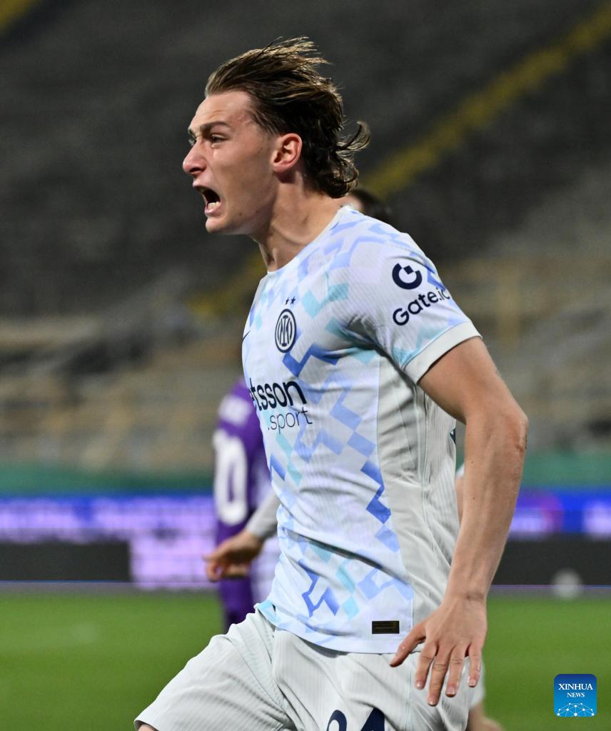 Inter Milan's Pio Esposito celebrates his goal during a Serie A football match between Fiorentina and Inter Milan in Florence, Italy, March 22, 2026. (Xinhua)