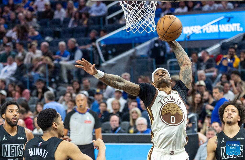 De'Anthony Melton (R) of Golden State Warriors goes for a layup during the 2025-2026 NBA regular season basketball game between Golden State Warriors and Brooklyn Nets in San Francisco, the United States, March 25, 2026. (Photo by Dong Xudong/Xinhua)