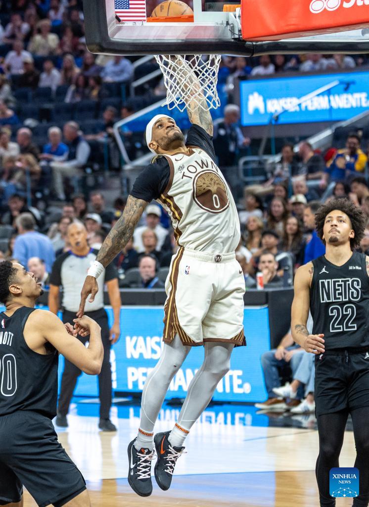 Gary Payton II (top) of Golden State Warriors dumps during the 2025-2026 NBA regular season basketball game between Golden State Warriors and Brooklyn Nets in San Francisco, the United States, March 25, 2026. (Photo by Dong Xudong/Xinhua)