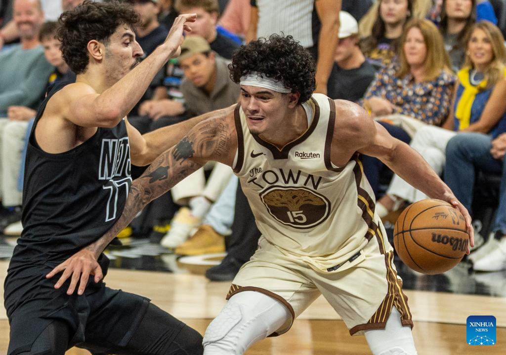 Gui Santos (R) of Golden State Warriors attempts to drive the ball during the 2025-2026 NBA regular season basketball game between Golden State Warriors and Brooklyn Nets in San Francisco, the United States, March 25, 2026. (Photo by Dong Xudong/Xinhua)
