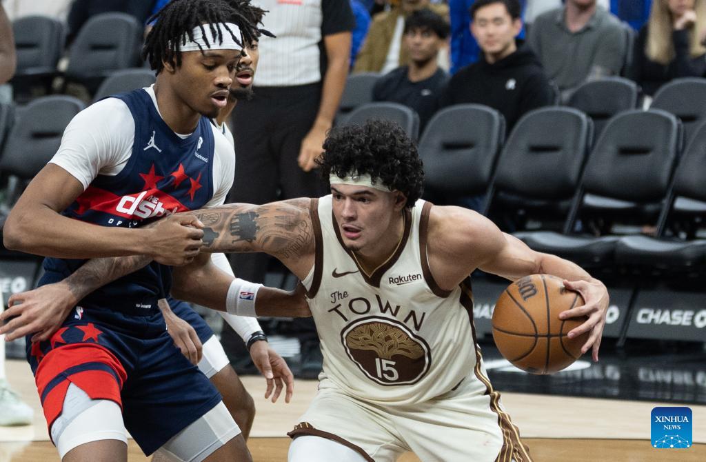 Gui Santos (R) of Golden State Warriors breaks through during the 2025-2026 NBA regular season basketball game between Washington Wizards and Golden State Warriors in San Francisco, the United States, March 27, 2026. (Photo by Arthur Dong/Xinhua)