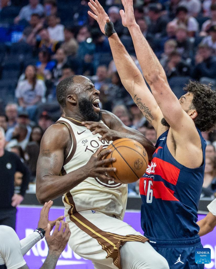 Draymond Green (L) of Golden State Warriors vies with Anthony Gill of Washington Wizards during the 2025-2026 NBA regular season basketball game between Washington Wizards and Golden State Warriors in San Francisco, the United States, March 27, 2026. (Photo by Arthur Dong/Xinhua)
