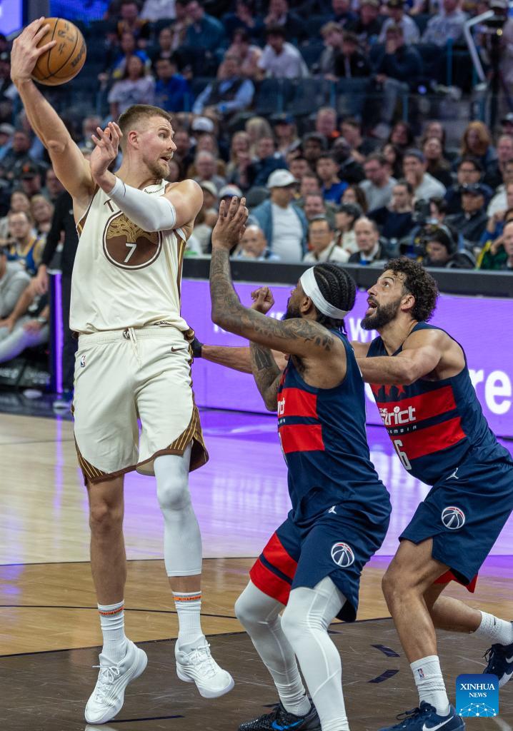 Kristaps Porzingis (L) of Golden State Warriors competes during the 2025-2026 NBA regular season basketball game between Washington Wizards and Golden State Warriors in San Francisco, the United States, March 27, 2026. (Photo by Arthur Dong/Xinhua)