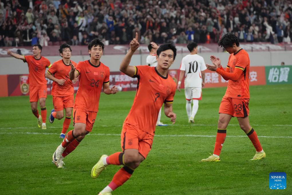 Players of China celebrate a goal during the football match between China U-23 and the Democratic People's Republic of Korea (DPRK) U-23 at 2026 CFA Team China International Youth Tournament in Xi'an, northwest China's Shaanxi Province, March 28, 2026. (Xinhua/Shao Rui)