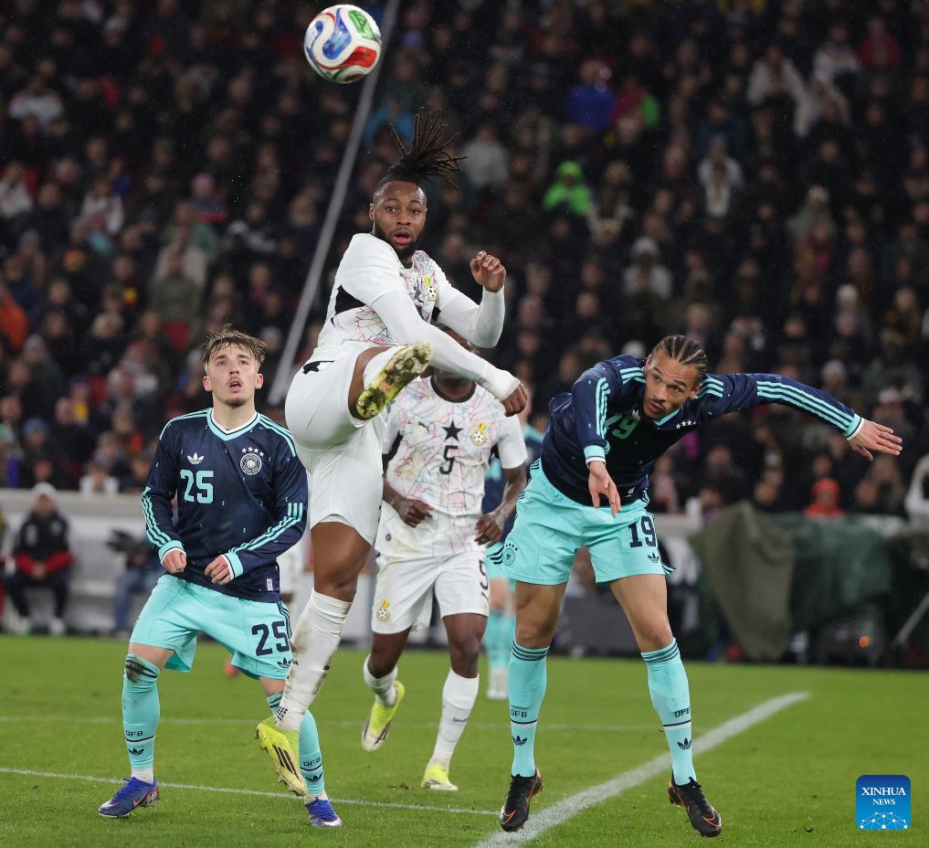 Kai Havertz (L) of Germany vies with Jonas Adjetey of Ghana during an international friendly football match between Germany and Ghana in Stuttgart, Germany, March 30, 2026. (Photo by Philippe Ruiz/Xinhua)