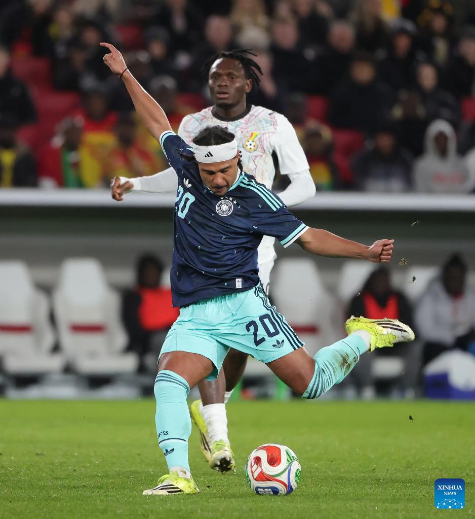 Nathaniel Brown (L) of Germany vies with Kwasi Sibo of Ghana during an international friendly football match between Germany and Ghana in Stuttgart, Germany, March 30, 2026. (Photo by Philippe Ruiz/Xinhua)
