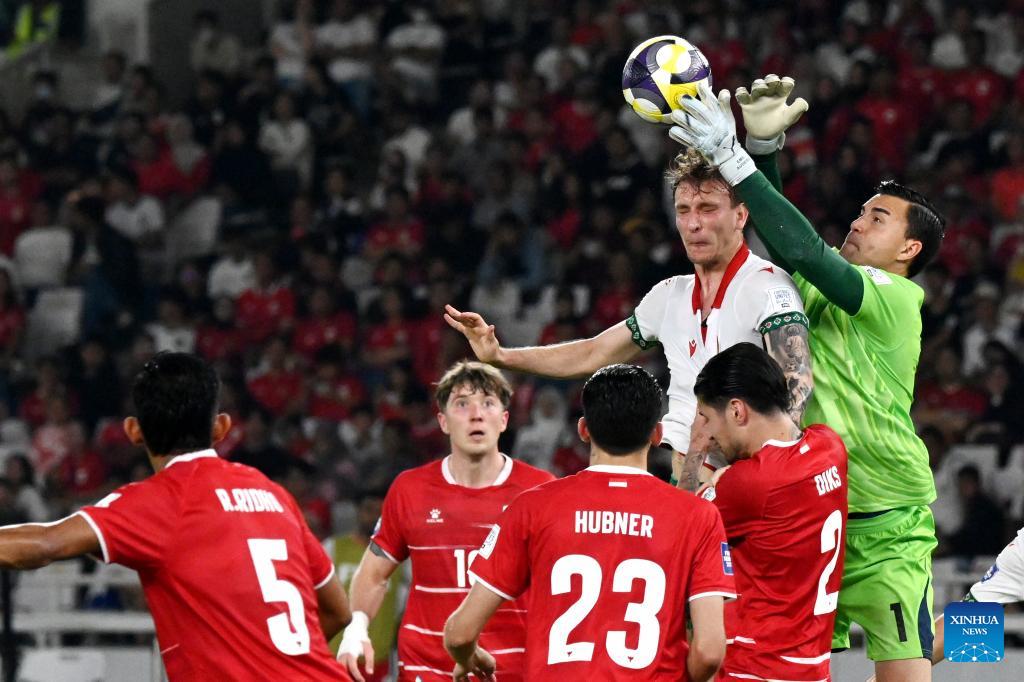 Emil Audero (1st R), goalkeeper of Indonesia, competes during the 2026 FIFA Series football match between Indonesia and Bulgaria at Gelora Bung Karno Stadium in Jakarta, Indonesia, March 30, 2026. (Xinhua/Agung Kuncahya B.)