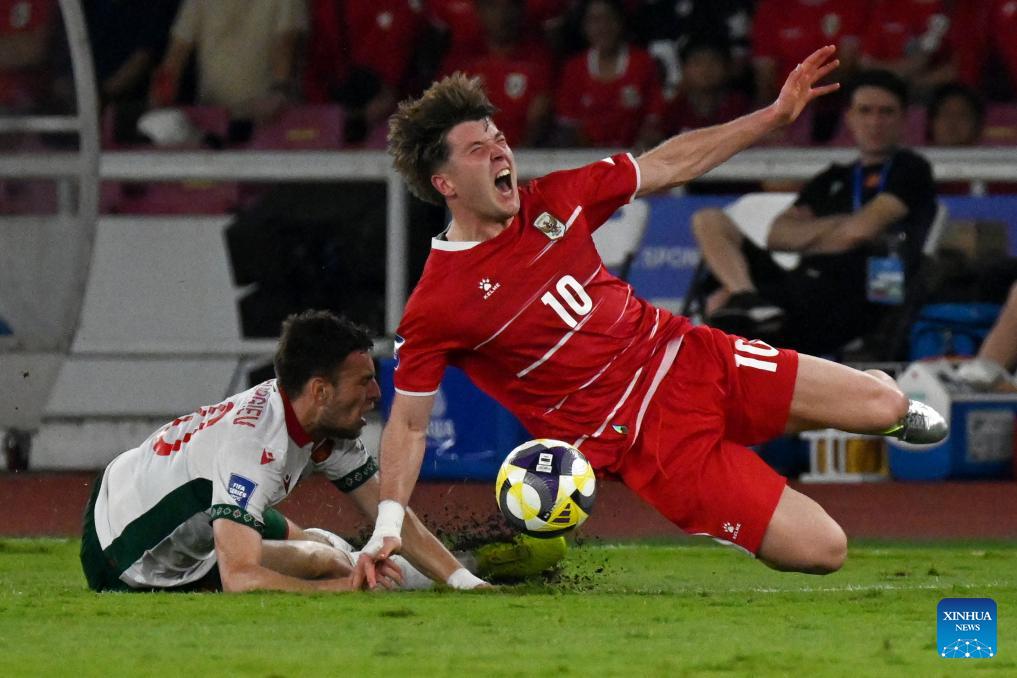 Ole Romeny (R) of Indonesia vies with Martin Georgiev of Bulgaria during the 2026 FIFA Series football match between Indonesia and Bulgaria at Gelora Bung Karno Stadium in Jakarta, Indonesia, March 30, 2026. (Xinhua/Agung Kuncahya B.)