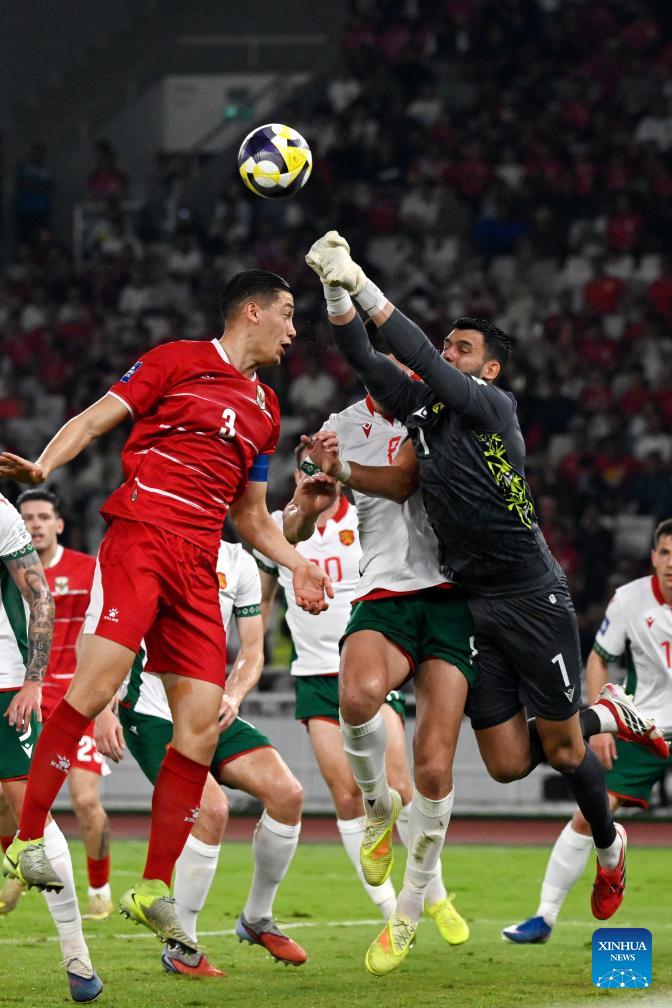 Jay Idzes (top L) of Indonesia vies with Dimitar Mitov, goalkeeper of Bulgaria, during the 2026 FIFA Series football match between Indonesia and Bulgaria at Gelora Bung Karno Stadium in Jakarta, Indonesia, March 30, 2026. (Xinhua/Agung Kuncahya B.)