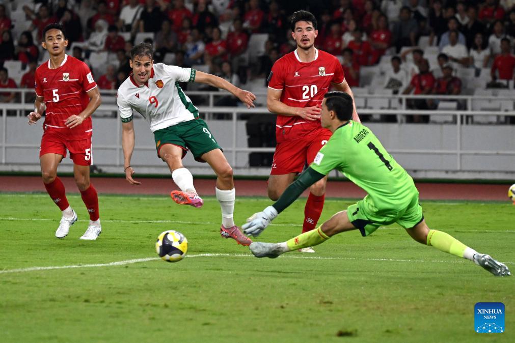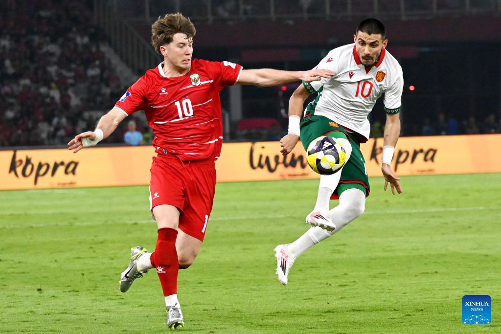 Vladimir Nikolov (2nd L) of Bulgaria kicks the ball during the 2026 FIFA Series football match between Indonesia and Bulgaria at Gelora Bung Karno Stadium in Jakarta, Indonesia, March 30, 2026. (Xinhua/Agung Kuncahya B.)