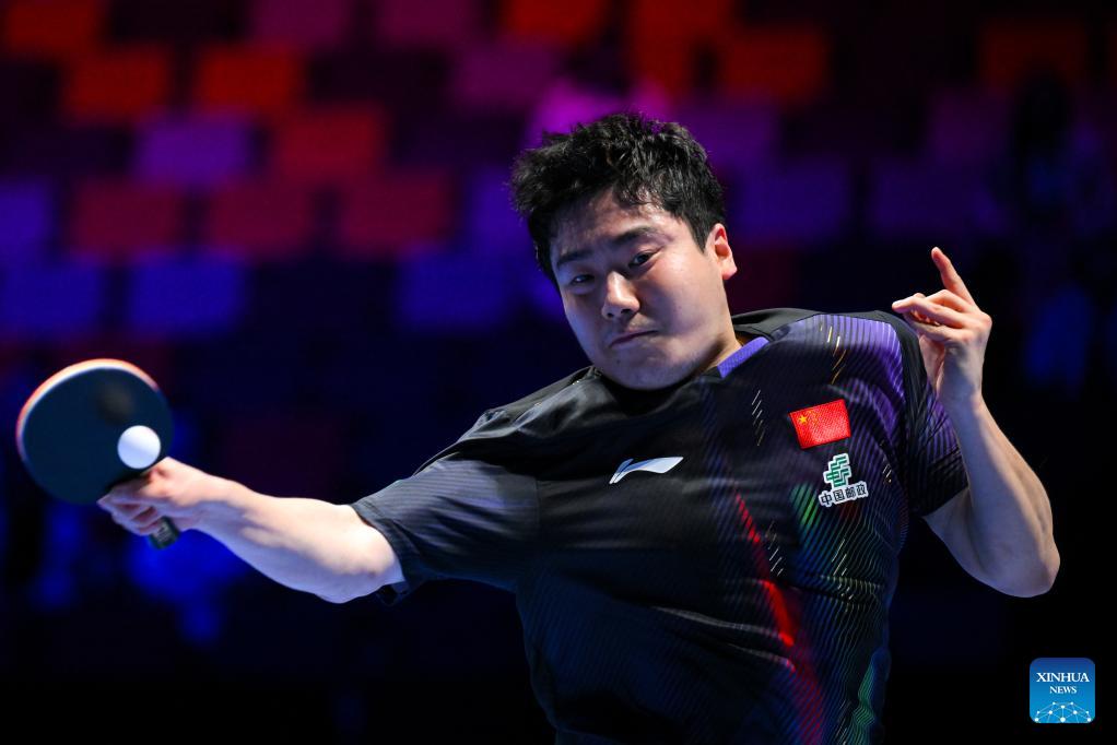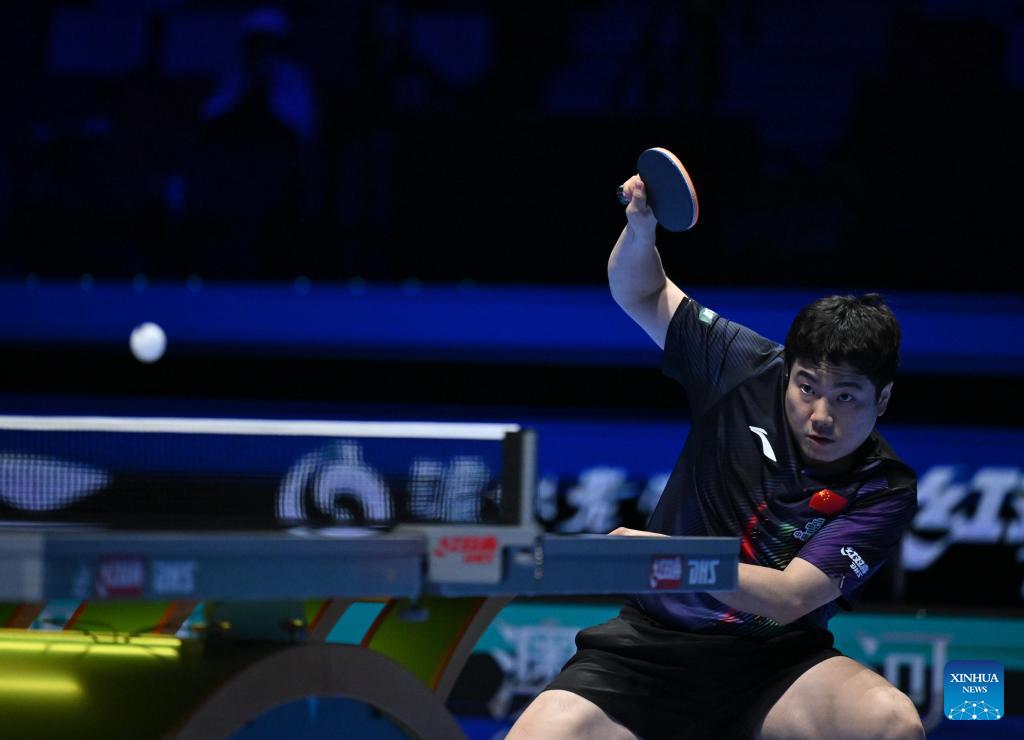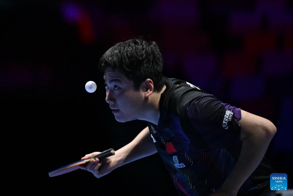 Liang Jingkun of China hits a return during the men's singles group 9 match between Liang Jingkun of China and Horacio Cifuentes of Argentina at the ITTF Men's and Women's World Cup 2026 in Macao, China, March 31, 2026. (Xinhua/Cheong Kam Ka)