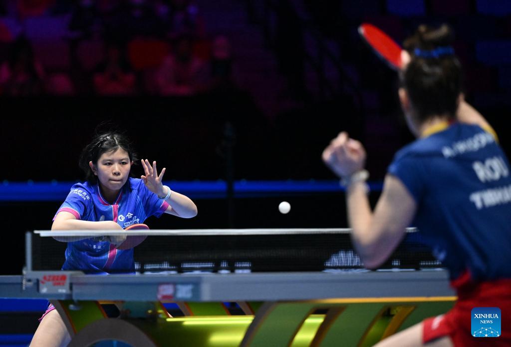 Yeh Yi-Tian (L) of Chinese Taipei competes during the women's singles group 3 match between Yeh Yi-Tian of Chinese Taipei and Andreea Dragoman of Romania at the ITTF Men's and Women's World Cup 2026 in Macao, China, March 31, 2026. (Xinhua/Yu Yang)