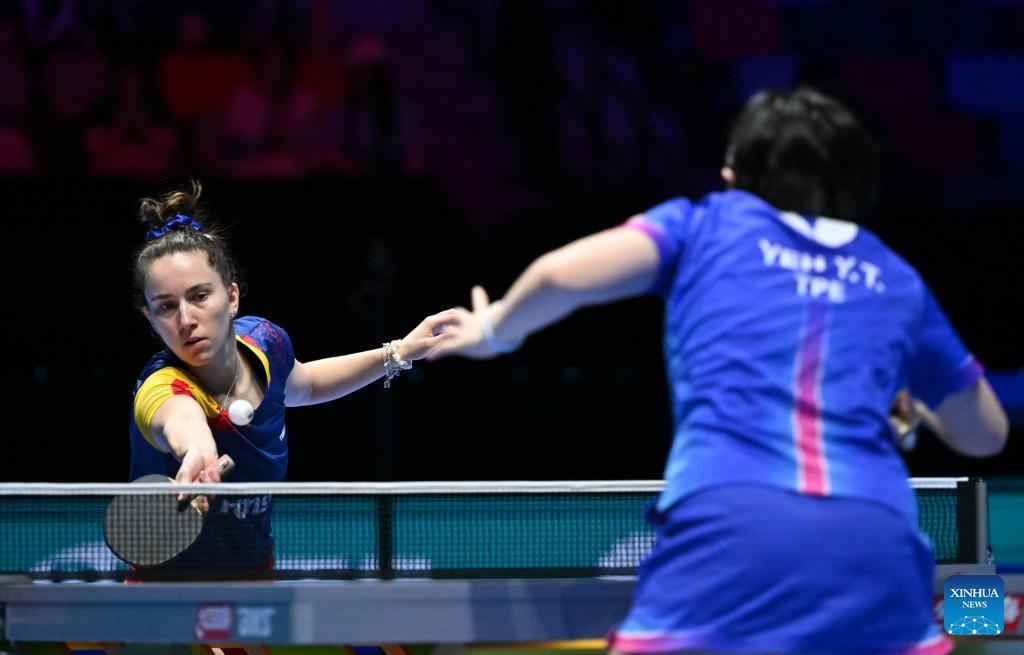 Andreea Dragoman (L) of Romania competes during the women's singles group 3 match between Yeh Yi-Tian of Chinese Taipei and Andreea Dragoman of Romania at the ITTF Men's and Women's World Cup 2026 in Macao, China, March 31, 2026. (Xinhua/Yu Yang)